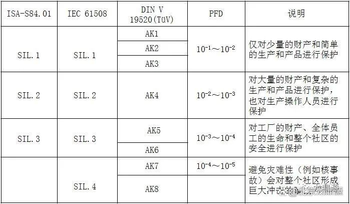 Secondo lo standard IEC, è diviso in SIL1-SIL4 da basso a alto, SIL1-SIL3 da ISA 84.01 e AK1-AI8 da basso a alto secondo Din V VDE0804. La relazione corrispondente tra loro è la seguente.