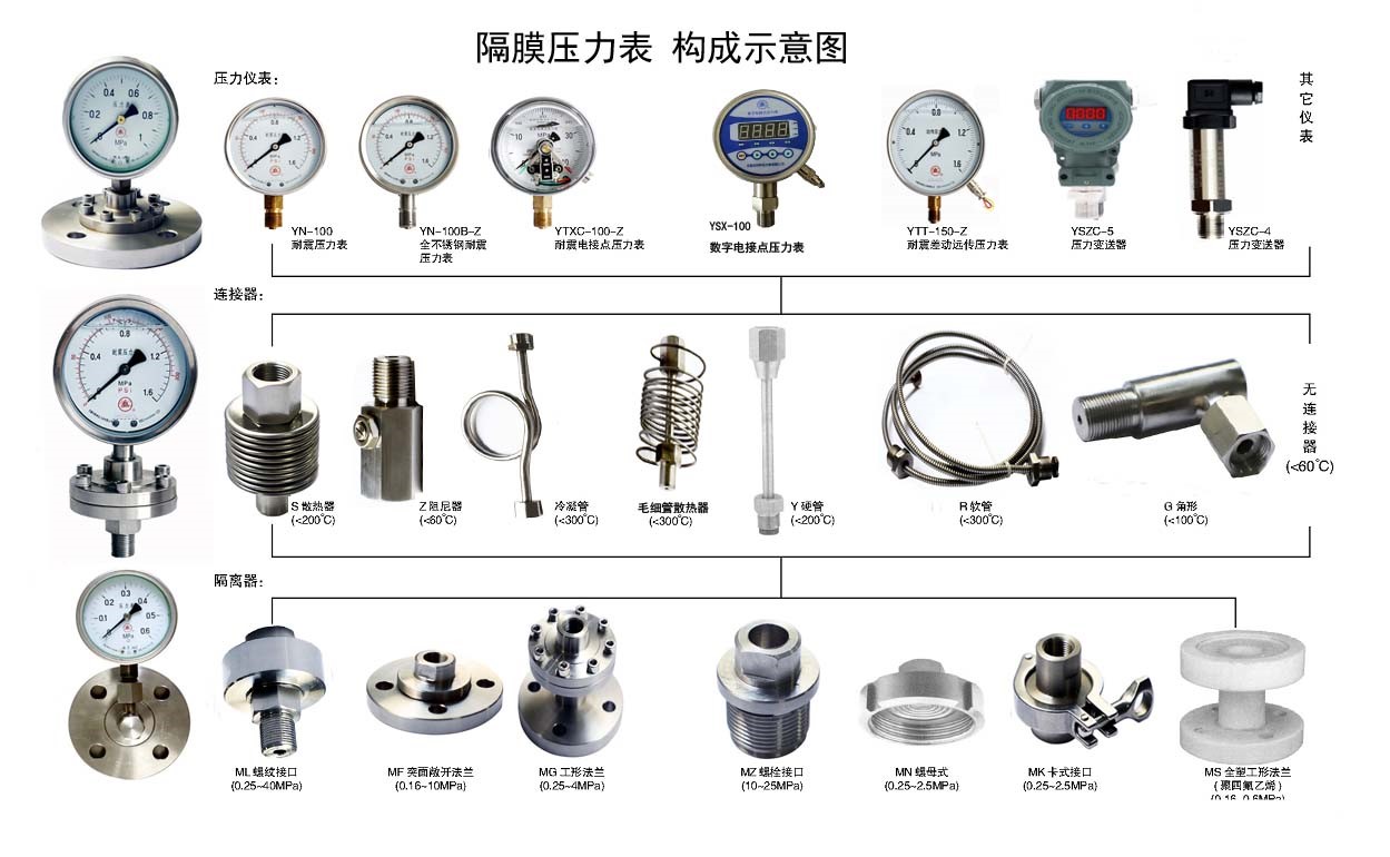 La testa del calibro di questo tipo di strumento può essere utilizzata in una varietà di serie: manometro generale, manometro per la pressione resistente agli urti, una varietà di indicatore di pressione di contatto elettrico, una varietà di estensione elettrica resistente agli urti, il trasmettitore di pressione, il manometro remoto, il manometro della pressione digitale, il controller di pressione e così via.